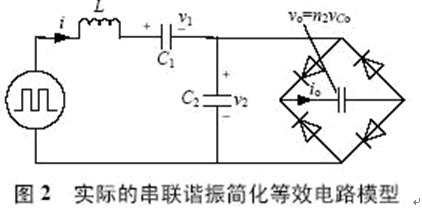 高頻升壓變壓器和高壓整流二極管的分布電容對充電電流的工作狀態(tài)影響較大,是不能被忽略的。變壓器的分布電容較為復(fù)雜,在高頻高壓升壓變壓器中,為減小變壓器體積和漏感,通常采用導(dǎo)磁率較高的鐵芯,如超微晶合金材料,變壓器原邊匝數(shù)較少;為減少變壓器原副邊耦合,通常設(shè)有屏蔽繞組;從而可以忽略原邊分布電容、原、副邊分布電容的影響。變壓器的激磁電抗較大,其影響也可以忽略。于是實(shí)際的串聯(lián)諧振電容器充電電路可等效于圖2 所示電路??梢钥闯?,實(shí)際電路變成了一個(gè)串并聯(lián)諧振充電電路。