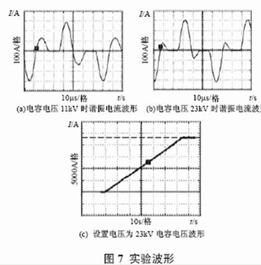 根據(jù)上面所設(shè)計(jì)的諧振參數(shù)進(jìn)行了實(shí)驗(yàn),實(shí)驗(yàn)波形如圖7 所示。可以看出,為保持充電電流恒定,隨著輸出電壓的升高,開關(guān)頻率變高,實(shí)測充電電壓為23kV 時(shí)變換器效率為92.7%。實(shí)驗(yàn)表明,所設(shè)計(jì)的諧振參數(shù)完全滿足設(shè)計(jì)要求,該裝置已用于神光III 能源系統(tǒng)。