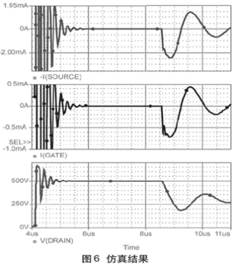 作為典型實例,諧振頻率在500kHz的范圍內,從漏極平臺到谷點的電壓變化為100V。根據式3,一般柵極電流峰-峰值幅度的大小是10mA。負值部分的范圍是5mA。