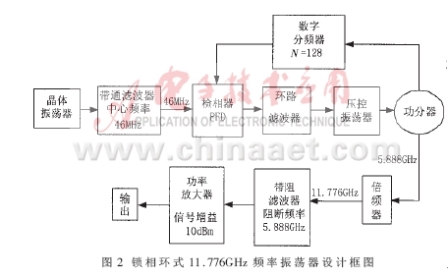 在該頻率振蕩器系統中,利用高穩定晶體振蕩源輸出信號經過中心頻率為46MHz帶通濾波器,提供一個高精確的穩定參考信號至檢相器,鎖相環路分頻計數器設置為128,達到鎖相后VCO輸出5.888GHz固定點頻信號,再經過高頻電路倍頻獲得11.776GHz的二次諧波。由于采用的倍頻器基波抑制性能較差,需要通過阻帶濾波和功率放大獲得足夠功率的高穩定低相位噪聲的高純度11.776GHz振蕩信號。圖2為整個頻率振蕩器系統的設計框架。
