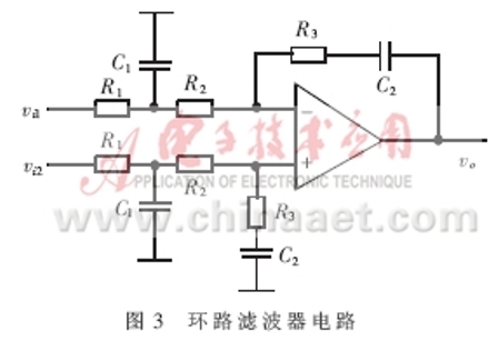為提高鎖相環路低通性能,在環路濾波器附加RC濾波器,在保證對控制線中干擾的足夠抑制的前提下,通常要求其3dB頻率點f3≥5fn以保證環路的穩定性。在實驗中,取f3=10fn=10MHz,則取R1=R2=1kΩ,C1≈1200pF。