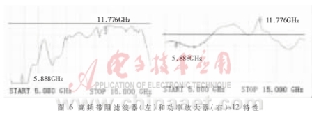 的連接線。濾波后采用低耗能的射頻放大器對信號進行功率放大以彌補濾波器的通帶衰減。功率放大器電路設計主要是隔直電路的設計,選用一級耦合微帶作為隔直電路,對11.776GHz信號增益可以達到10dB左右。圖6給出了用網絡分析儀測得的帶阻濾波器和功率放大器的s12特性。