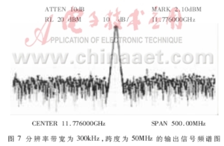 在整個鎖相頻率綜合器系統,需要測量的電路單元主要有:分頻式鎖相環環路特性、高頻帶阻濾波器特性、高頻信號功率放大單元和整個頻率綜合系統的輸出頻譜特性。用Marconi 10kHz~1GHz信號發生器提供高精度46MHz參考信號,用HP8592A頻譜分析儀測量輸出信號頻率特性。頻譜結果如圖7所示,系統輸出信號頻率點在11.776GHz,系統輸出信號功率為3.64dBm。用同樣頻譜分析儀測量系統輸出信號的單邊帶相位噪聲。取偏離載頻為1kHz的測試波形,測得其單邊帶相位噪聲為-72.8dBc/Hz@1kHz。