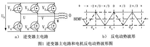 實現無刷直流電機電子換相及PWM控制的逆變器主電路如圖1a所示。采用兩兩通電方式,即每一個瞬間有兩個功率管導通,每隔60°電角度換相1次,每一功率管導通120°電角度。功率管的導通順序是:V6V1→V1V2→V2V3→V3V4→V4V5→V5V6。