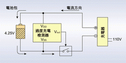 過度充電保護IC的原理為:當外部充電器對鋰電池充電時,為防止因溫度上升所導致的內壓上升,需終止充電狀態(tài)。此時,保護IC需檢測電池電壓,當到達4.25V時(假設電池過充點為4.25V)即激活過度充電保護,將功率MOSFET由開轉為切斷,進而截止充電。