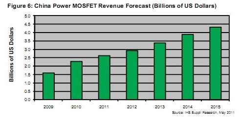 據(jù)IHS iSuppli公司的研究,2010年中國功率MOSFET市場快速增長,銷售額達(dá)到23億美元,比2009年的16億美元增長43%。