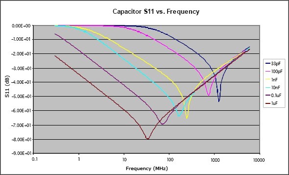 之后,電容的阻抗將呈現出電感性。由此可見,電容器只是在頻率接近或低于其SRF時才具有去耦作用,在這些頻點電容表現為低阻。圖3給出了不同容值下的典型S11參數,從這些曲線可以清楚地看出它們的SRF,還可以看出電容越大,在較低頻率處所提供的去耦性能越好(所呈現的阻抗越低)。