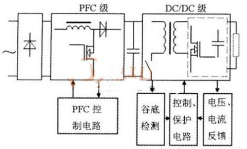 所研究的開關電源結構如圖1所示,采用兩級PFC結構,由PFC預變換器、隔離變換器和同步整流電路組成的DC/Dc變換器以及檢測與保護電路組成。交流電壓經整流后先輸入到PFC預變換器進行功率因數校正變換,再由電源控制電路控制隔離變換器,將直流電壓轉換成高頻交流脈沖電壓,此脈沖電壓經同步整流器整流、濾波電路濾波后,得到所需的直流。
