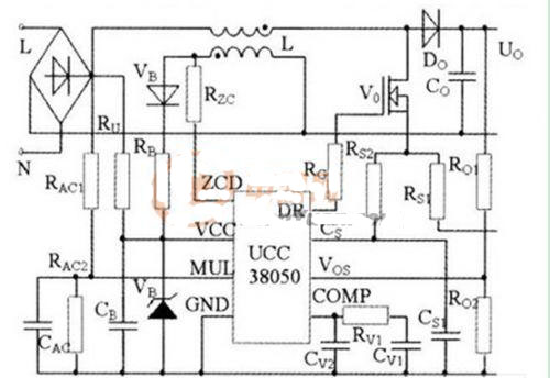 UCC38050為過渡模式PFC控制器,功耗低,工作電流僅1.5mA.PWM開關頻率由自激振蕩產生而且頻率可變,不存在Boost二極管反向恢復過程,減少了反向恢復損耗,非常適合于中小功率綠色開關電源設計。
