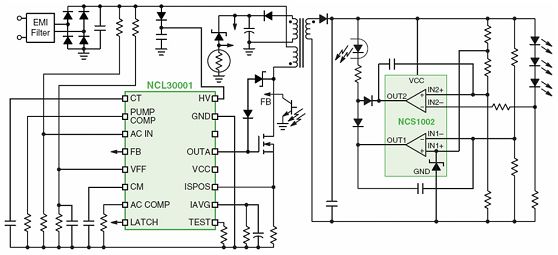 NCL30001是一種單段拓撲結(jié)構(gòu)LED驅(qū)動方案,其靈活的特性非常適合應(yīng)用于新的LED照明產(chǎn)品,其他規(guī)格特性還包括高壓啟動電路、電壓前饋以改善環(huán)路響應(yīng)、輸入欠壓檢測、內(nèi)部過載定時器、閂鎖輸入,以及減少輸入線路諧波的高精度乘法器。這種方案采用連續(xù)導(dǎo)電模式(CCM)工作,集成了PFC和隔離型DC-DC轉(zhuǎn)換電路,并提供恒定電流來直接驅(qū)動LED,相當于將AC-DC轉(zhuǎn)換與LED驅(qū)動兩部分電路整合在一起,均位于照明燈具內(nèi),省去了LED光條中集成的線性或DC-DC轉(zhuǎn)換器。這種整體式方案的電源轉(zhuǎn)換段更少,減少元器件使用數(shù)量(如光學(xué)元件、LED、電子元件及印制電路板等),降低系統(tǒng)成本,并支持更高的LED電源總體能效。當然,這種方案的功率密度更高,可能并不適合所有區(qū)域照明應(yīng)用,其光學(xué)圖案可能更適合較低功率的LED,典型應(yīng)用包括LED街燈、外墻燈、洗墻燈及電冰箱箱體照明等。