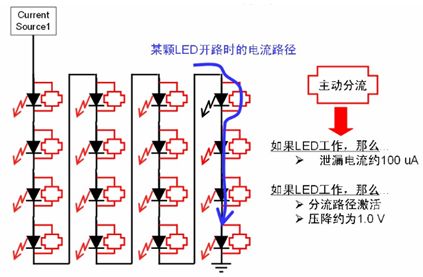 區(qū)域照明應(yīng)用中通常會采用多串LED,雖然LED本身可靠性高,但若LED串中的某個LED開路,那么整串LED就可能關(guān)閉,而街道照明等應(yīng)用中必須避免這種狀況,從而降低后期維護成本。為了增強LED串的可靠性,這種安森美半導(dǎo)體推出了NUD4700 LED電流旁路保護器。NUD4700器件是一款分流器件,當LED串中某個LED開路時,就會提供電流旁路,確保整串LED不會關(guān)閉;而且恰當處理散熱的話,還可支持大于1 A的大電流,其工作原理如圖8所示。