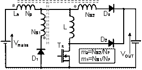 這個創(chuàng)新的電路是按照軟開關(guān)標準設(shè)計的,如圖4所示,為恢復(fù)小線圈L貯存的電能,在升壓線圈LB 附近新增兩個二極管 D1和D2 和兩個輔助線圈NS1和NS2 。