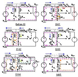 在t0前,BC²電路的特性與傳統(tǒng)升壓轉(zhuǎn)換器的特性相同。升壓二極管DB 導(dǎo)通,通過體電容器發(fā)射主線圈能量。