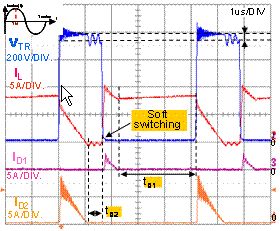 在t3時,功率晶體管關(guān)斷。這時,COSS電容電壓被小線圈L內(nèi)貯存的電流線性充電,直到二極管D2導(dǎo)通為止;在關(guān)斷期間,功率開關(guān)上沒有過壓應(yīng)力。[page]