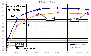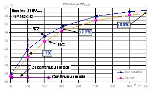 一旦功率因數(shù)校正器進入斷續(xù)模式(<100 W),碳化硅二極管與BC²電路的能效相同,如圖8所示。