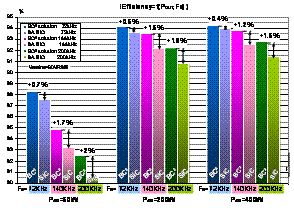 在圖11的示例中,一個導(dǎo)通電阻RDS(on)小于0.46Ω的、輸出功率450 W的功率MOSFET與一個碳化硅二極管和兩個并聯(lián)功率MOSFET的結(jié)構(gòu)的能效相同。