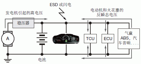 電子控制單元、傳感器和信息娛樂系統等汽車電子設備連接在一根電源線上(圖4)。這些電子產品的電源是電池和交流發電機,這兩種電源的輸出電壓都不穩定,容易受溫度、工作狀態和其他條件影響。此外,使用燃油噴射系統、閥、電機、電氣和水解控制器等電磁線圈負載的汽車系統,會把ESD、尖峰噪聲和其他類型的瞬態和浪涌電壓引入到電源和信號線上。