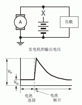 最糟糕的浪涌電壓發生在引擎運轉時電池斷開,交流發電機為汽車電源線提供電流時,這種情況就是所說的“甩負荷”。大多數汽車制造商和工業協會都會為這種甩負荷狀態制定最高電壓、線路阻抗和這種甩負荷狀態的持續時間,如圖5所示。甩負荷的電源阻抗會高于正常瞬態測試時的電源阻抗,因為電池斷開而只有發電機在向外輸出電能,這時交流發電機的內部線圈相當于一個限流電阻。