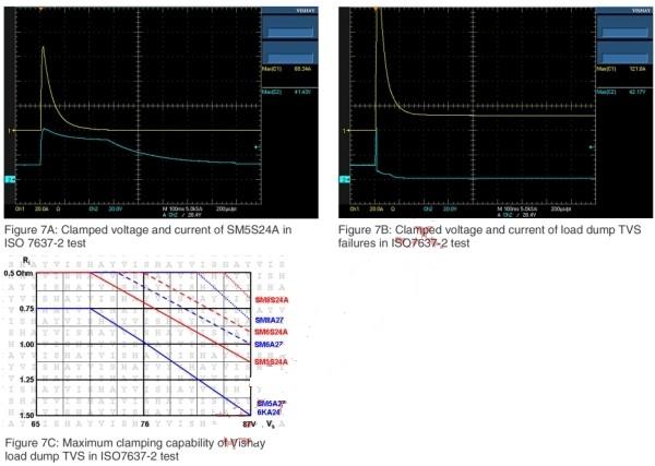 在具有13.5V Vbatt和400ms脈寬的ISO-7637-2 pulse 5測試條件下,Vishay甩負荷TVS的最大鉗位性能如圖7C所示。為防止出現圖7B中的失效,需要充分考慮TVS的最大定額。