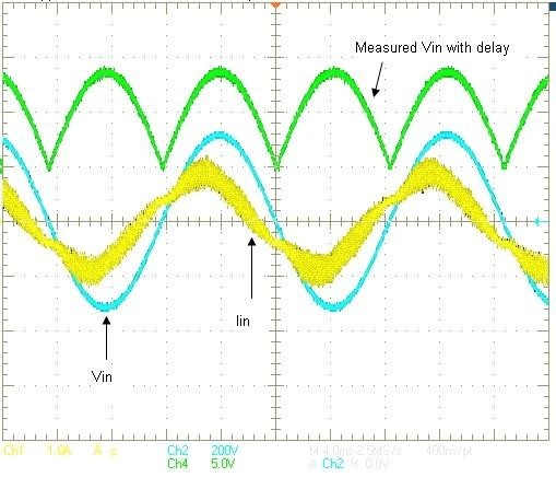 首先,輸入AC電壓通過(guò)ADC測(cè)量。固件讀取測(cè)量到的電壓信號(hào),再加上一些延遲,然后使用延遲后的信號(hào)來(lái)生成電流參考。圖7、8顯示了1100W無(wú)橋PFC的測(cè)試結(jié)果。在該測(cè)試中,VIN=220V,VOUT=360V,而負(fù)載=108W(約滿載的10%)。通道1為IIN,通道2為VIN,通道4為帶延遲的測(cè)量到的VIN信號(hào)。圖7中,測(cè)量到的VIN沒(méi)有增加延遲,PF=0.86,THD=8.8%.而在圖8中,測(cè)量到的VIN信號(hào)被延遲了300us,這種情況下,PF被改善到0.90.此外,還可以進(jìn)一步改善PF,但這將以犧牲THD為代價(jià),因?yàn)檫M(jìn)一步延遲電流參考,將在AC電壓交叉點(diǎn)處產(chǎn)生更多的電流失真。在圖9中,測(cè)量到的VIN被延遲了500us,此時(shí),PF被改善到0.92.但是,電流在電壓交叉點(diǎn)處出現(xiàn)了失真。結(jié)果,THD變得更糟糕,達(dá)到11.3%.