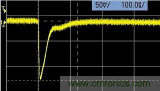 這是任何電源都存在的正?,F象。當負載吸收電流發生跳變的瞬間,就會造成電源輸出端的電壓瞬間偏離設定值。這個示波器屏幕的截圖(圖1),就是當我的一個電源的負載電流,從1mA 瞬間變化到500mA時, 輸出電壓經歷了約30uS 瞬間變化。