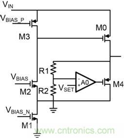 圖3:M4位于放大器反饋環路中、無輸出電容器的LDO。