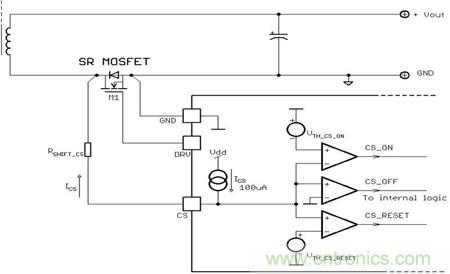 CS_OFF比較器是非常精密的真正的零比較器,通過同步整流將系統能效提升至最高。NCP4305的CS腳和SR MOSFET(M1) 之間的電阻用來調節關斷電流。當CS腳電壓低于VTH_CS _ON閾值時,M1 導通;當CS腳電壓高于VTH_CS _OFF閾值時,M1關斷。