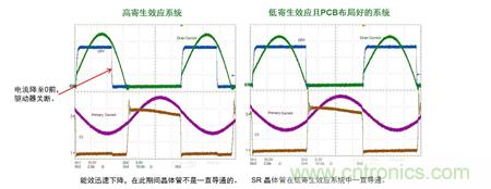 在CCM應用中,當初級端MOS管導通時,通過隔離驅動器強制使次級端MOS管關斷;當初級端MOS管關斷, TRIG腳功能使次級端MOS管導通。這種交替導通特性大大提高系統能效。如圖5所示,無觸發功能的初級端和次級端驅動信號交疊的時間為40 ns,遠大于帶觸發功能的12 ns,也就是說,觸發功能將縮短延遲時間,從而降低損耗。