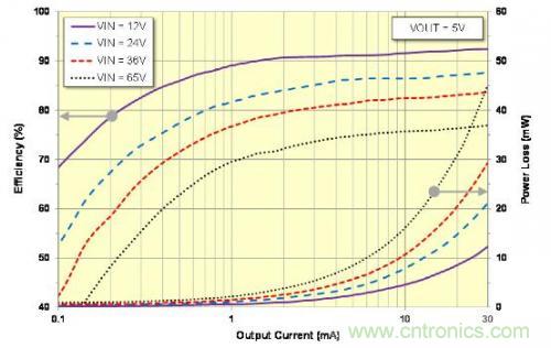 LM5165 中內置的面向智能傳感器應用的各種特性包括一種用于實現最佳解決方案尺寸的簡單控制架構、用于提供低壓差的 100% 占空比能力、一個用于電源軌排序和故障報告的漏極開路電源良好指示電路、在內部固定或從外部可調的軟起動 (SS)、以及具有可定制遲滯以提供可編程線路欠壓閉鎖 (UVLO) 功能的高精度啟用。而且,一種可調的逐周期電流限制優(yōu)化了電感器選擇和尺寸。圖 3 顯示出了對于 0.1mA 至 30mA 負載電流的轉換器效率和功率耗散。