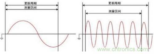 3.選擇合適的量程、更新率和同步源對功率分析儀的測量準確性至關重要。例如當更新周期小于被測信號周期時,如下圖4所示,整個更新周期內的數據成為測量區間,整個更新周期內的采樣數據將被平均,因此影響測量結果的準確性。在這種情況下需要增大更新周期,使得包含更多周期的被測信號進入測量區間;