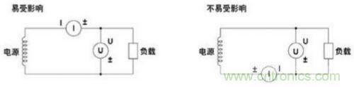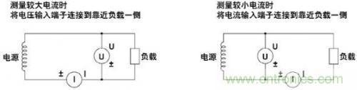 5.降低功率損耗的影響,在測量大電流情況下,需要將電壓測量回路接到靠近負載一側,電流測量回路測得的結果就是流經負載和電壓測量回路的電流之和,測量誤差僅是流經電壓測量回路的電流。在測量小電流情況下,則需要將電流測量回路接到靠近負載一側,電壓測量回路測得的結果就是負載電壓和電流測量回路的電壓之各,測量誤差僅是電流測量回路兩端電壓;如圖6所示。
