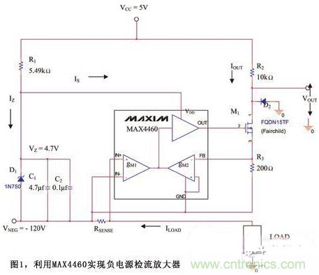 圖1所示電路提供了一種負電源電流檢測的原理框圖,利用MAX4460或MAX4208儀表放大器,配合一些分立元件實現(xiàn)。