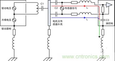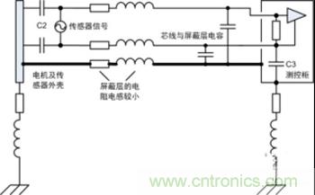 4)此處電機(jī)平臺(tái)和測(cè)控柜已有接地,通過(guò)傳感器連接線屏蔽層又將兩者連接,形成地環(huán)路。然而實(shí)際工程應(yīng)用中地環(huán)路往往不可避免地存在,本例中若沒(méi)有屏蔽層依然會(huì)通過(guò)C2、電纜和C3產(chǎn)生高頻地環(huán)路,從這方面看屏蔽層改變了環(huán)路路徑。