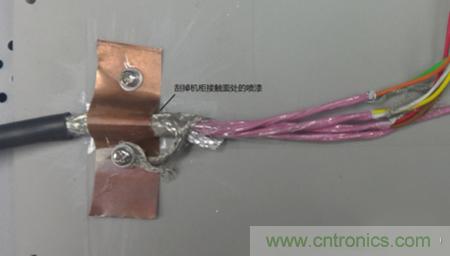 從安全方面考慮,三個(gè)機(jī)柜都必須接大地,強(qiáng)電線路與信號(hào)線分開避免干擾這些都是要遵循的基本原則。實(shí)際機(jī)柜間位置較遠(yuǎn),接地對(duì)于高頻干擾改善不多,只作為安全措施。解決這種問(wèn)題一般考慮是從干擾源、傳播路徑、敏感設(shè)備三方面著手。驅(qū)動(dòng)器和功率分析儀是成型的設(shè)備,不便于改動(dòng),考慮從傳播路徑入手,使用多芯屏蔽電纜連接扭矩傳感器到測(cè)控柜,傳感器端屏蔽層連接到傳感器外殼,也與電機(jī)平臺(tái)連通,另一側(cè)屏蔽層接到測(cè)控柜機(jī)殼。最初的時(shí)候屏蔽層通過(guò)一根較長(zhǎng)的線連接到測(cè)控柜,發(fā)現(xiàn)并沒(méi)有改善,最后使用銅片將整根線壓到機(jī)柜,干擾得到很大衰減。