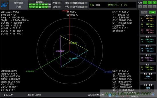 此時(shí)將系統(tǒng)運(yùn)行起來(lái),通過(guò)功率分析儀的數(shù)據(jù)和波形再次進(jìn)行驗(yàn)證,電壓波形圖和矢量圖都很完美。