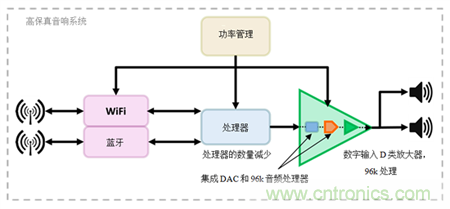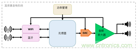 處理器執(zhí)行各種音頻處理功能,如解碼和信號均衡,同時也處理Wi-Fi和/或藍(lán)牙通信軟件堆棧。過去,CD品質(zhì)的采樣頻率可能已足夠。但是今天的高保真音頻系統(tǒng)對信號鏈中的處理器提出了其它要求,因?yàn)楦弑U嬉糍|(zhì)要求在24位音樂信號流中提供48kHz至192kHz范圍內(nèi)的采樣率。