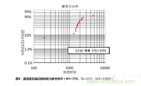 以上失效點(diǎn)集成為圖8所示的威布爾曲線(xiàn)圖,從圖中可以得到,在參考條件下F(t)=10%的壽命為1210年。同時(shí),在此威布爾分析中,排除了最大點(diǎn)和最小點(diǎn)。所以,在參考條件下,3.3kV IGBT的壽命LTb=1210年。