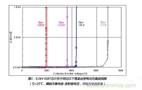 一般來(lái)說(shuō),擊穿電壓會(huì)隨著IGBT芯片邊緣電荷量QSS的增加而降低。圖1為6.5kV 高壓IGBT芯片的擊穿電壓隨著QSS變化的曲線(xiàn)圖。高濕度工況下的失效機(jī)理如下所述。