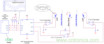 心率監(jiān)測系統(tǒng)設(shè)計(jì)的一種基本方法采用了一種定制的的微控制器(MCU),它被用于控制外部LED驅(qū)動(dòng)器的脈沖信號發(fā)生,并同時(shí)讀取一個(gè)分離的光電管上的電流輸出數(shù)據(jù)。已知光電管的電流輸出必須轉(zhuǎn)換為電壓,輸出給模擬到數(shù)字轉(zhuǎn)換(A/D)單元,圖2中的原理圖說明了這類系統(tǒng)的基本原理。已知電流到電壓轉(zhuǎn)換器在光電管電流為0時(shí)產(chǎn)生一個(gè)等于VREF的電壓,而隨著電流的增加電壓將下降。