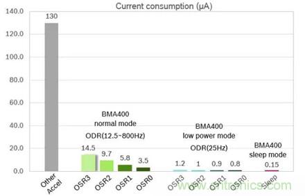 BMA400在低功耗模式(low power mode)消耗的電流會更低,最低可以達(dá)到0.8uA (800nA,OSR=0) 。