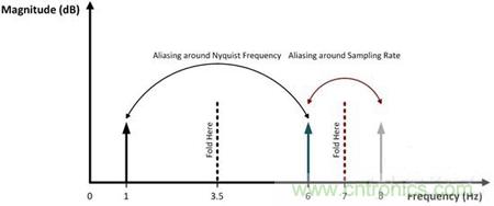 不過,你怎么能知道6Hz正弦波將會在1Hz和8Hz時出現混疊呢?在頻率域內觀察混疊會使得這一點變得很明顯。當使用ADC進行采樣時,輸入信號的頻率成分,從DC開始,在數倍于采樣率的頻率上重現。現在,你應該明白術語“折返”為什么經常被用來描述信號的混疊方式了—如果你沿著虛線將圖3折疊起來看,這些信號互相之間完美地重疊在一起。