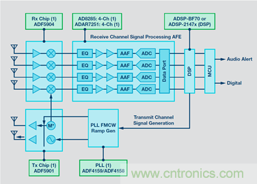 ADI公司負責24GHz芯片組的應用工程師Patrick Walsh在介紹此方案時指出,這是ADI最新的開發平臺——演示雷達,演示雷達是一款完整的天線到比特解決方案,擁有完整的ADI信號鏈。這個產品包括一個兩通道發送,四通道接收解決方案,提供執行FM-CW調制的斜坡PLL,ADC可以將基帶信號轉換進入DSP,為我們提供完整的信號鏈。該演示雷達只需連接USB和電源,用戶就可以啟動運行,在幾分鐘之內收到雷達信號。