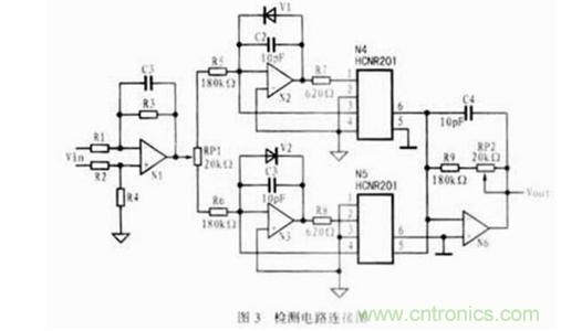 在實際檢測電路的某一采集信道中,如需對一組差動輸入信號進行檢測,可將電路接成如圖3所示的連接方式。圖中,通過放大器N1可將輸入的差動信號變?yōu)閱芜呅盘柡筝敵觥S捎诙O管V1和V2的作用,當(dāng)輸入信號為正時,V2導(dǎo)通,V1截止,放大器N2呈開環(huán)狀態(tài),光耦N5工作,N4關(guān)斷;而當(dāng)輸入信號為負(fù)時,則正好相反。當(dāng)HCNR201的第3、4端的光敏二極管受光后,其輸出信號將反饋到放大器的輸入端,以提高光耦的線性并減少溫漂。第5、6端輸出的信號經(jīng)運放放大后輸出。電位器RP1的作用是調(diào)節(jié)運放輸入偏置電流的大小。電容C2、C3為反饋電容,可用于提高電路的穩(wěn)定性,消除自激振蕩,濾除電路中的毛刺信號,降低電路的輸出噪聲,其容值可根據(jù)電路的頻率特性來選取。放大器N6的作用是把光耦輸出的電流信號轉(zhuǎn)變?yōu)殡妷盒盘栆怨┖蠹夒娐肥褂茫⒃鰪娯?fù)載驅(qū)動能力,降低輸出阻抗。調(diào)整電阻RP2的值可以調(diào)整信道的增益。