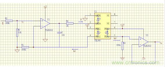 由于按照線性光耦的技術(shù)說明,發(fā)射端和兩個接受端都使用時能在一定范圍因此,本電路將線性光耦的D0,D1,D2端都配置了相關(guān)電路。