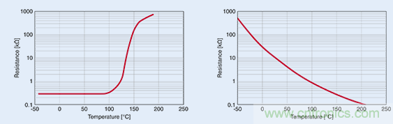 在超出某一特定溫度時,正溫度系數(shù) (PTC) 熱敏電阻(左圖)的電阻出現(xiàn)急劇升高,故而適合用作溫度限值傳感器。而負溫度系數(shù) (NTC) 熱敏電阻的電阻則呈線性關系,故而適用于溫度測量。