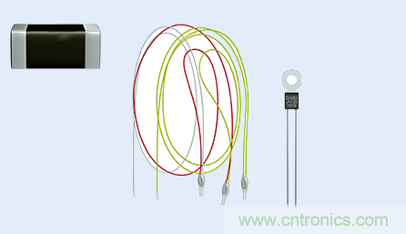 從左至右:安裝在印刷電路板上的SMT正溫度系數(shù) (PTC) 傳感器、與電機繞組進行集成的正溫度系數(shù) (PTC) 傳感器、安裝在散熱片上帶接線端子的正溫度系數(shù) (PTC) 傳感器。