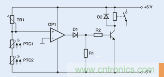 切換原理:記錄溫度限值圖3顯示為由兩個串聯(lián)正溫度系數(shù) (PTC) 傳感器組成的一個簡單電路,。TR1與兩個正溫度系數(shù) (PTC) 傳感器組成一個分壓器,該分壓器能夠提供運算放大器的非反相輸入,而運算放大器則充當比較器的角色。
