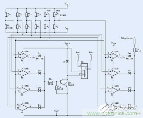 2個開關閾值的參考值將通過2個微調器,即R7和R8(分別為2.2 k?)進行設置。如上所述,兩個微調器將分別產生900?或550?的電阻。至于8個所需的比較器(U1A-U1D以及U2A-U2D),則采用經濟型LM324放大器。在滿負荷跳線模式下進行的一個持續(xù)數(shù)小時的測試表明,風扇能夠在85℃時可靠地進行開啟。由于系統(tǒng)具有相對較低的熱量期限,故而無需采用常用的滯回比較器電路。