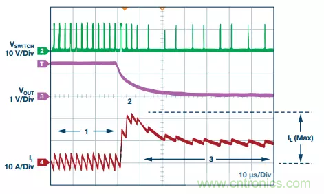 最初,峰值電感電流由選定的電感值、電源開關(guān)導(dǎo)通時(shí)間、電路的輸入和輸出電壓以及負(fù)載電流設(shè)置(圖中用“1”表示)。當(dāng)電路短路時(shí),電感電流迅速上升,直至達(dá)到限流點(diǎn),即 RS × IINDUCTOR (IL)等于最大電流檢測(cè)電壓,以保護(hù)器件和下游電路(圖中用“2”表示)。然后,內(nèi)置電流折返限制(圖中數(shù)字“3”)進(jìn)一步降低電感電流,以將熱應(yīng)力降至最低。