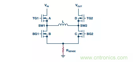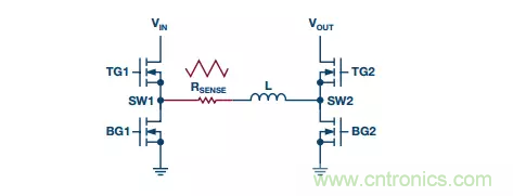 圖9電路解決了這個(gè)問題,其將檢測(cè)電阻與電感串聯(lián),從而在降壓和升壓模式下均能連續(xù)測(cè)量電感電流信號(hào)。由于電流檢測(cè) RSENSE連接到具有高開關(guān)噪聲的SW1節(jié)點(diǎn),因此需要精心設(shè)計(jì)控制器IC,使內(nèi)部電流比較器有足夠長(zhǎng)的消隱時(shí)間。